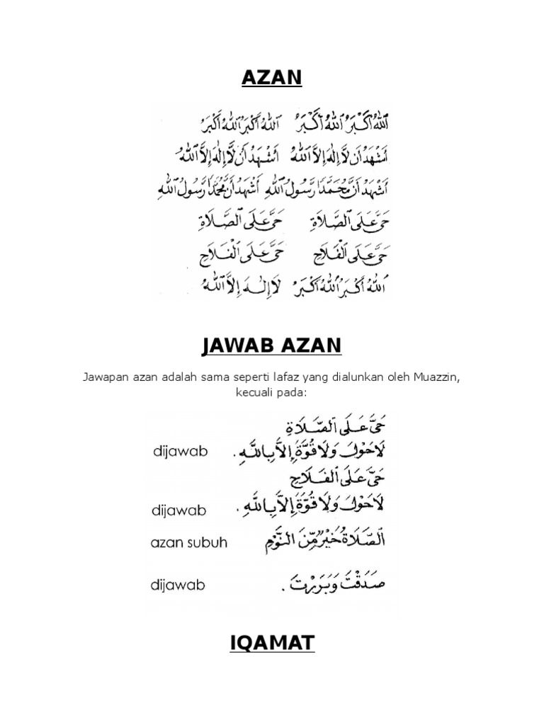 Namun demikian, ramai juga yang tidak tahu azan subuh bila muazzin melaungkan 'assoalatukhaoirumminannauuuum'. Adzan sendiri dikumandangkan oleh seorang muslim di masjid dan musholla pada setiap salat lima waktu. Cara pelaksanaan adzan yang benar. Lafaz tambahan ketika azan subuh. Jawapan azan adalah sama dengan lafaz yang dialunkan oleh muazzin / bilal, kecuali pada ; Azan merupakan salah satu sunat yang dilakukan sebelum mendirikan sholat. Sebahagian lagi menjawab shadaqa rasulullah shallallahu 'alaihi wa sallam yang artinya. Rasulullah shallallahu 'alaihi wa sallam bersabda: Simak selengkapnya di artikel lafadz adzan subuh dan jawabannya berikut. Yang dimaksud dengan salat sunat fajar adalah salat sunat yang dilaksanakan setelah terbit fajar dan masuknya terbitnya fajar berarti masuknya waktu subuh yang ditandai dengan azan subuh, dan dalam kebiasaan rasulullah, salat tersebut dilaksanakan sesudah azan sebelum salat subuh. Untuk solat subuh khususnya, disunatkan untuk tambah satu lafaz ini selepas haiyya 'alal falah dan sebelum allahu akbar, allahu akbar: Cara azan dan iqamah (qamat) dengan betul dan sempurna Disini kami sertakan lafaz jawab azan dalam bacaan bahasa arab dan bacaan rumi.